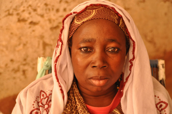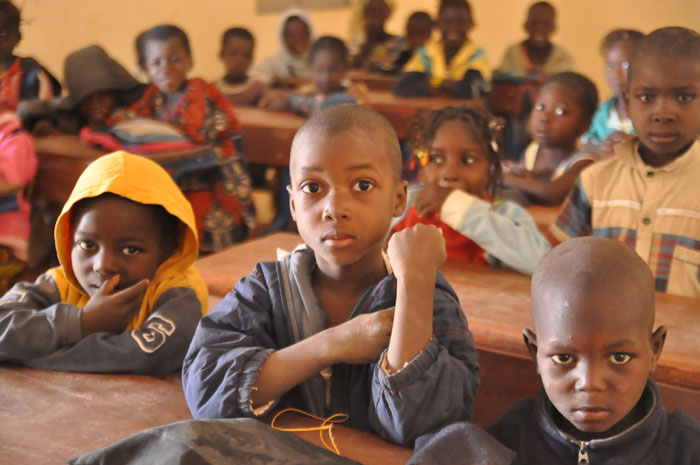 av växter här, det är inte bra. Vattnet kommer inte fram. Fälten är ganska små, några hundra kvadratmeter var och de omges av jordvallar. När vi hoppar mellan vallarna och raderna av grönsaker pekar han på några plantor. - Titta de är alldeles fransiga, det ser inte bra ut, det är klimatförändringarna. Abdoulaye kör vidare till skolan han vill visa hur barnens framtid ser ut här. Där finns två hus, ett av dem liknar en ruin. Det är ungefär 40 barn i varje klass som trängs i de enkla bänkarna. På avstånd hörs klara barnaröster deklamera en text - Det är för att vi inte har