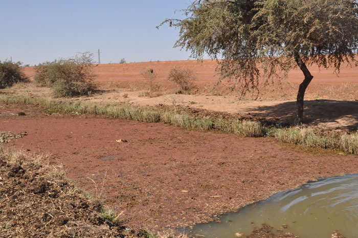 med folk som flytt den avancerande öknen. Vi passerar flera samhällen byggda i traditionell stil med hus av lera som tillsammans med höga murar inhägnar fyrkantiga gårdsplaner. Det känns som en arkaisk stil av stad med raka gator och små torg. Medina kallas stilen här och lite längre fram ligger Medina 39. Här svänger Abdoulaye elegant ner in genom den trånga entrén till sin gårdsplan. - Vi bor 2000 personer här i Medina 39, säger han och alla är bönder. Först vill Abdoulaye visa upp omgivningarna på en ny motorcykeltur. Först är det fälten. Mitt ute i den brännande solen är det tomatskörd, säsongens gröda. När vi svänger ner från vägen visar Abdoulaye mig på vattnet i kanalen. - Titta det är alldels grönt