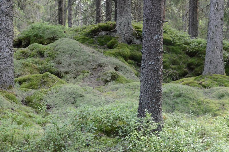 med tallar och lövträd. Mossan glänser vackert och blåbärsriset brer ut