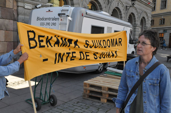Bekämpa sjukdomar - inte de sjuka, står det på banderollen bakom Margareta Tigers rygg när hon talar på Mynttorget utanför Riksdagen. Hon är initiativtagare till ett upprop i försvar för de sjukskrivnas rättigheter som samlat mer än 100 000 namn och som just skall överlämnas till socialförsäkringsutskottet, som mangrant infunnit sig. Samtliga partier är där bland de 300 personerna och Miljöpartiet har skickat sitt språkrör Peter Eriksson. - De här generella reglerna