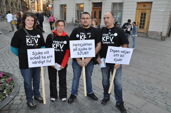 men det finns inga belägg för detta. Madeleine Hermansson är med i kamratföreningen Vänkraft i Uddevalla och var en av 300 på manifestationen. - Han säger att vi inte har belägga för att folk hamnar illa, men det är ju mer än 100 000 som skrivit på. Han rackar ju ner på oss allihopa, jag blev faktiskt arg när jag hörde det. Jag har inte fått någon rehabilitering genom försäkringskassan och jag tror inte att jag kommer att få det heller. Jag har inte ens träffat min handläggare på två år. Det enda jag fått veta är att jag måste infinna mig på arbetsförmedlingen, men ingen kontaktperson. Jag skall tydligen bara gå dit och anmäla mig. Jag fattar inte, min läkare säger ju att jag inte kan arbeta och att jag behöver minst ett års rehabilitering till, då tycker jag att de skulle lyssna på det. Vänkraft består av 60 personer med olika psykiatriska diagnoser, många av dem har nu fått problem med sin sjukersättning. Madeleine har en diagnos som innehåller depressioner, ätstörningar och självskadebeteende. För en månad sedan försökte hon ta sitt liv eftersom hon inte orkade med Försäkringskassan längre. - Som tur var överlevde jag. Men jag vet inte hur länge jag ska fortsätta orka kampen med försäkringskassan längre, den har fått mig att tappa fotfästet med livet och allt i vardagen känns så totalt meningslöst. Madeleine har tvingats söka hjälp hos socialtjänsten, men det har inneburit att hon fått sälja av sina besparingar. Hon hade fonder som hon fått efter sin farfar och som var tänkta att hon skulle använda för framtida studier. - Nu har jag skatteskulder efter den försäljningen på 8000 kronor som jag inte vet hur jag skall betala. Det blir ju ingen trygghet, sista månaderna har det varit så kritiskt att jag inte haft pengar tillmat, jag har levt på knäckebröd och vatten. Om vi inte får vår rehabilitering och blir bättre kommer vi att stupa när vi går ut i arbete och då är det ingen som vill ha oss. Vi har inte valt att bli sjuka, vi vill kunna arbeta som andra människor. Marina Oskarsson var också med på manifestationen, hon lider av fibromyalgi sedan många år tillbaka. Hon har försökt att arbeta vid flera olika tillfällen, senast var hon med och drev en camping tillsammans med ungdomar. - Då brände jag ut mig ganska rejält. Jag har flera gånger tvingats att arbeta och pressat mig själv. Men jag har också velat för det är jobbigt att gå hemma. Men nu har jag väl accepterat läget, att jag inte klarar av att arbeta. Fast nu accepterar inte försäkringskassan det, helt plötsligt Marina har gått igenom en Pila-undersökningen, en grundlig undersökning av ett team. Den kom fram till att hob varken var arbetsoförmögen eller möjlig att rehabilitera. Hon fick ett års förlängning av sin tidsbegränsade sjukersättning, men när hon ansökte om ytterligare sex månader fick hon nej. - Jag skall lägga in om socialhjälp, jag har ju inga tillgångar. Jag kan inte ta arv, det måste jag avsäga mig, mamma får skriva om det. Vi har ett sommarhus som vi har haft sedan jag var liten, men ärver jag det kommer socialen att ta det. Det är inget märkligt, men det är allt för oss, vi har haft det sedan jag var liten. Mina ungar skulle ju också att drabbas. Socialförsäkringsminister Cristina Husmark Pehrsson försvarar förändringarna som hon menar kommer att ha positiva effekter. - Arbetsförmedlingen ska erbjuda alla personer vars dagar med sjukpenning eller sjukersättning har tagit slut deltagande i ett kortare introduktionsprogram som syftar till att ta fram en plan för fortsatta insatser för att personen ska kunna återgå i arbete. När det är klarlagt hur den enskildes situation ser ut och vilka insatser som kan vara aktuella ska personen kunna hänvisas till Arbetsförmedlingens ordinarie insatser, som eget arbetssökande, deltagande i aktiviteter utanför garantierna eller erbjudas plats i fas 1 av jobb- och utvecklingsgarantin (JUG) alternativt jobbgarantin för ungdomar (JOG). Hon menar att det inte finns skäl för dem att känna sig mindre trygga i det system som tar vid efter den 1 januari, i stället kommer de att kunna räkna med ett betydligt mer aktivt stöd än tidigare. Gertie Gladnikoff känner sig inte lugnad av ministerns besked - Det hela är ett experiment med sjuka människor. De sjuka ska kastas ut från sjukförsäkringen och in i ett program på Arbetsförmedlingen för långtidsarbetslösa. Många kommer inte att klara det på grund av sin ohälsa och många kommer dessutom att få betydligt lägre ersättning än tidigare Regeringen tror att människor blir friskare av fattigdom Att kastas ut i ekonomisk ovisshet när man är sjuk är förödande för hälsan |